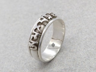 Jolie bague en argent massif sur laquelle est gravé le mantra tibétain Om Mani Padme Hum.