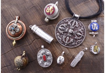 Les bijoux sont par exemple martelés de mantras (syllabes sacrées), garnis de pierres précieuses et semi-précieuses, exécutés dans des matières nobles : argent massif, or.