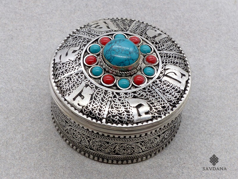 Jolie boite à bijoux, en métal argenté, avec le mantra Om Mani Padme Hum.