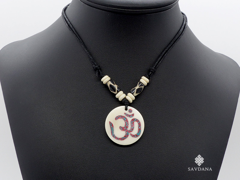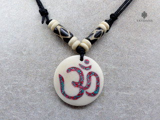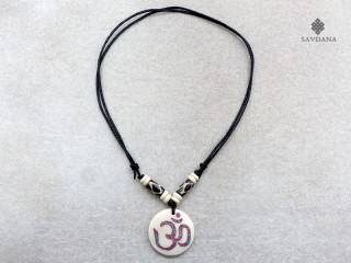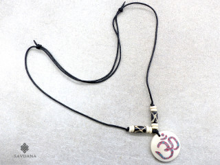 Beau collier composé d'un galon noir et d'un pendentif en os de buffle, avec le symbole Om.