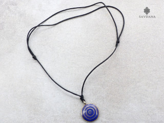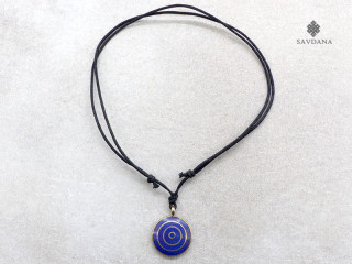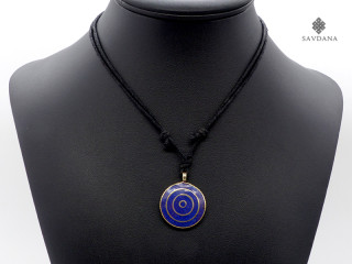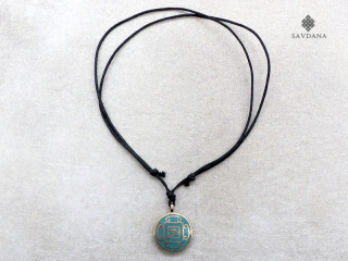 Beau collier composé d'un galon noir et d'un pendentif en métal, avec un mandala.