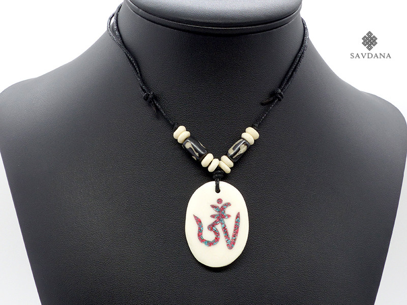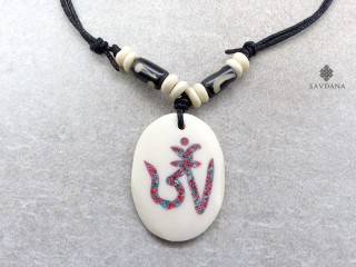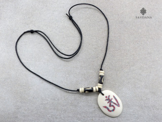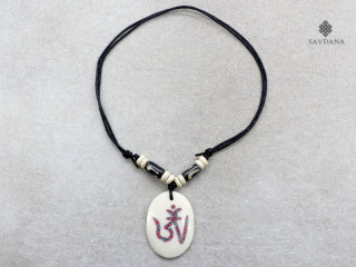 Beau collier composé d'un galon noir et d'un pendentif en os de buffle, avec le symbole Om.