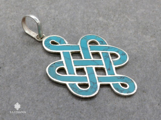 Beau pendentif en argent massif représentant le nœud sans fin, un des signes auspicieux du bouddhisme, ou astamangala.